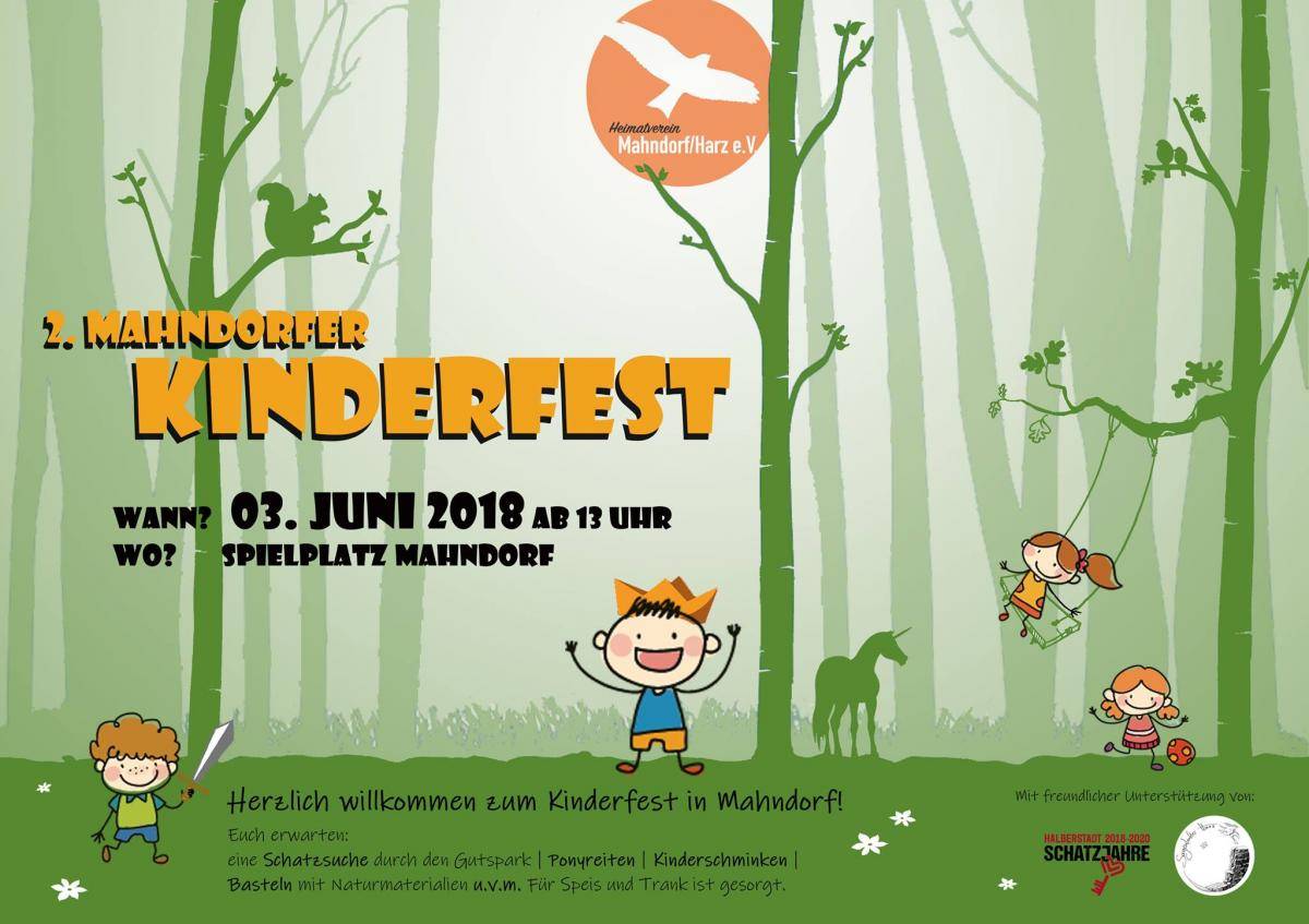 Anlässlich des Internationalen Kindertages lädt der Heimatverein Mahndorf/ Harz e.V. in Kooperation mit "Sagenhafter Harz" und "Halberstadt Schatzjahre" zum 2. Mahndorfer Kinderfest ein.