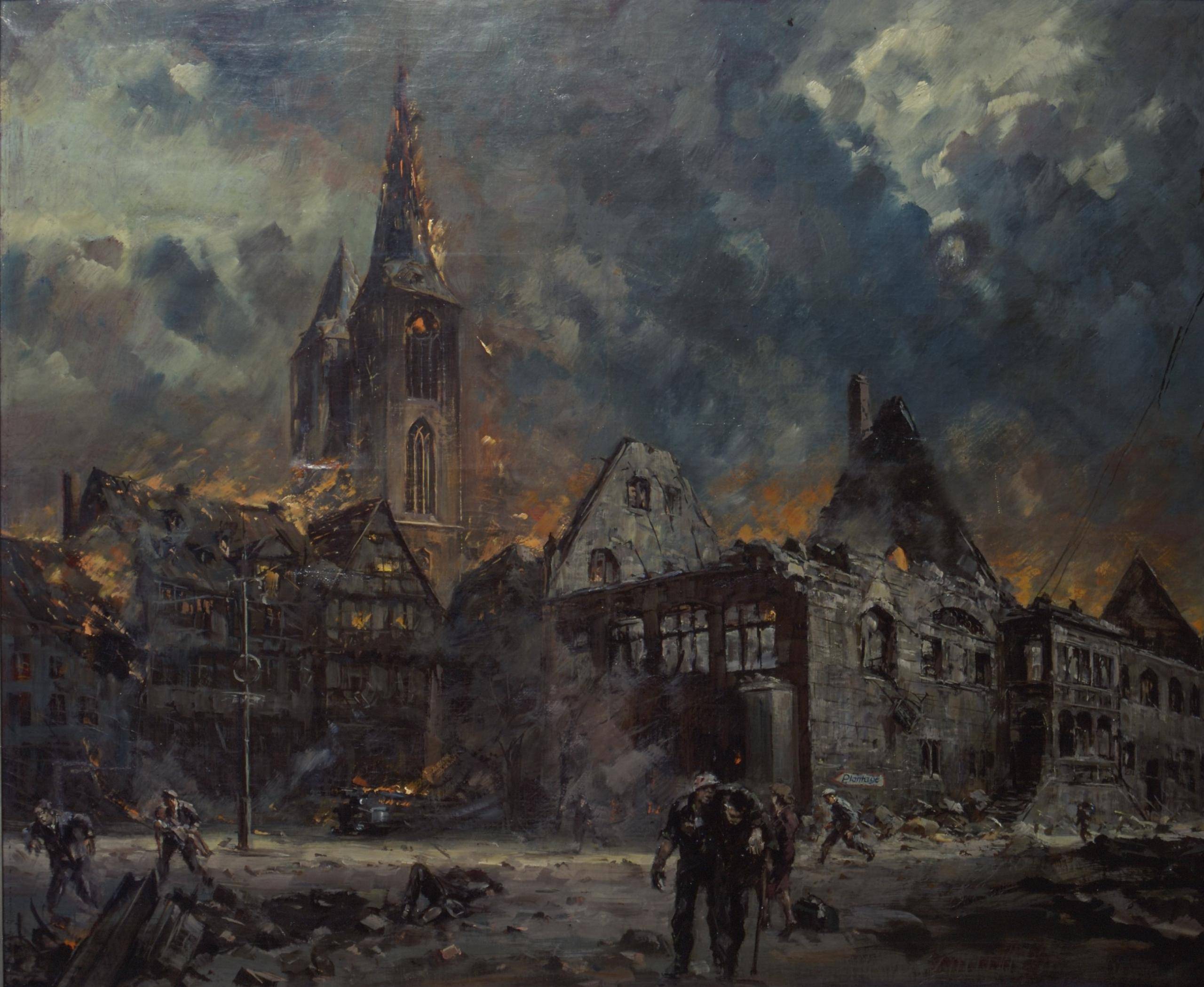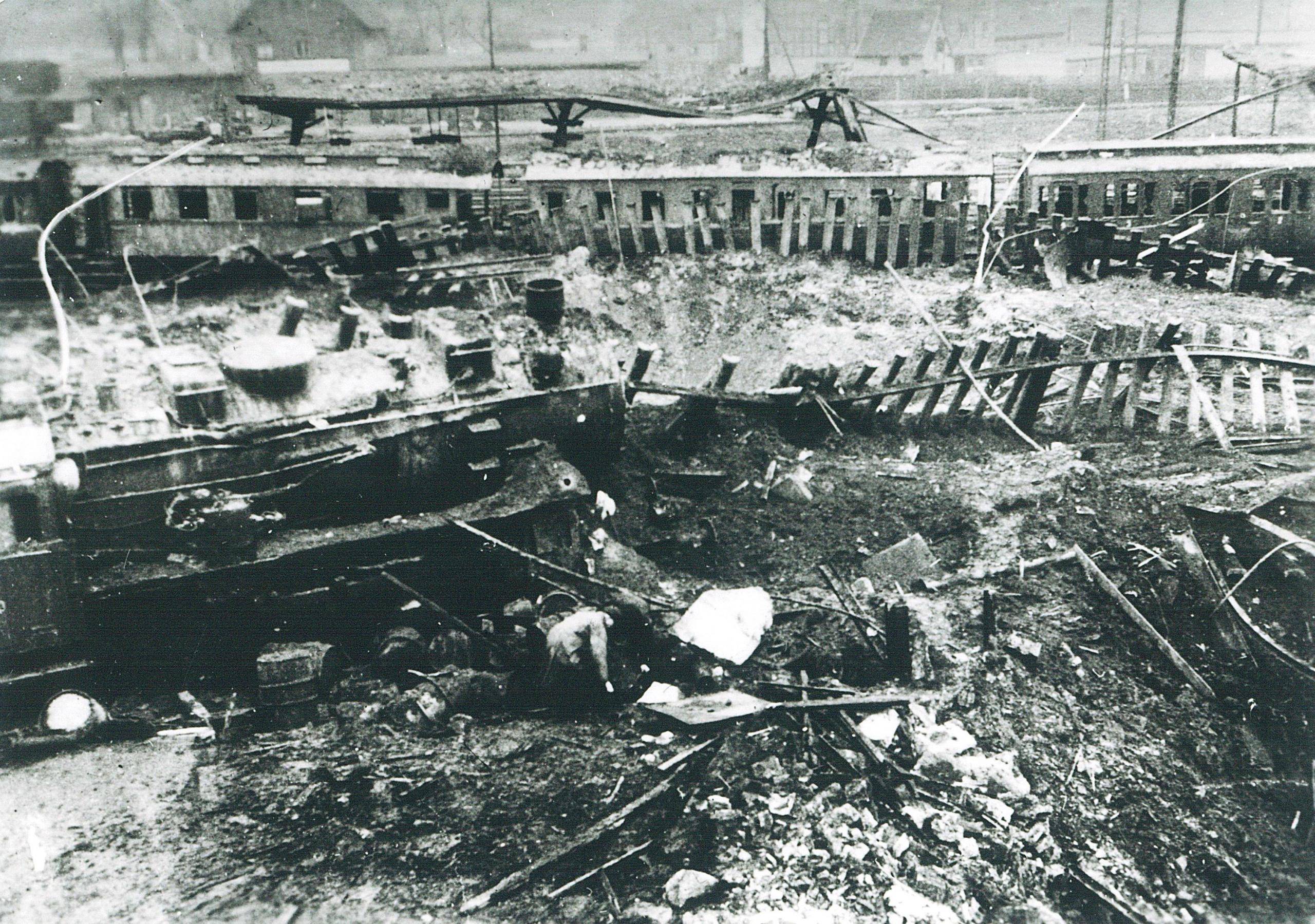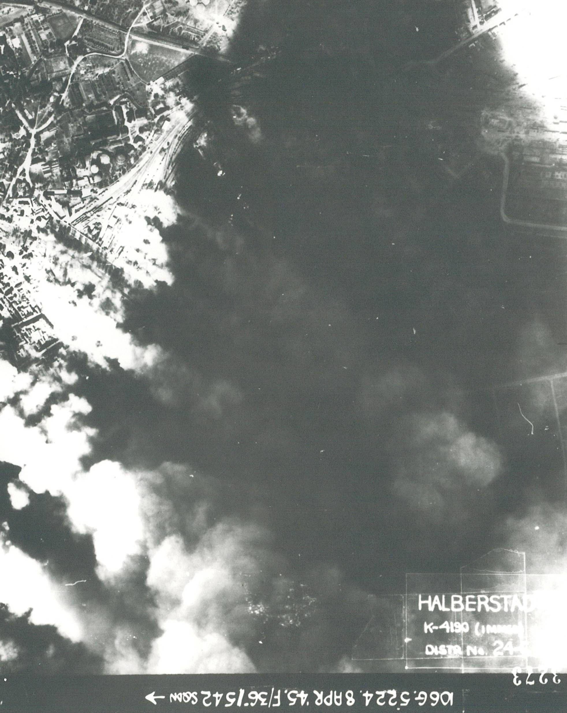 "Der Luftkrieg und die Bombardierung von "feindlichen" Städten und Industrieanlagen begannen 1940. So spürten auch Halberstadts Bürger die furchtbaren Luftangriffe. Die Stadt erlebte 10 Luftangriffe. Die ersten hatten die Junkers - Flugzeugwerke, den Flugplatz und den Bahnhof als Ziel. Am 7. April 1945 griffen Jagdbomber auf den Hauptbahnhof einen abgestellten Munitionszug an. Die Seeminen, mit denen der Zug beladen war, explodierten. Der Bahnhof mit Gebäuden und Gleisanlagen wurde zerstört, der Zugverkehr musste komplett eingestellt werden. Luftdruckschäden gab es in weiten Teilen des Stadtgebietes. Nur einen Tag später, am 8. April 1945, erfolgte der zehnte und schwerste Luftangriff auf Halberstadt. Von verschiedenen Flugplätzen in Mittelengland starteten gegen 9.00 Uhr, 215 amerikanische Fernbomber des Typs B - 17, die durch "Mustang" - Langstreckenjäger begleitet wurden. Um 11.10 Uhr wurde "Luftalarm" ausgelöst. Schon 11.25 Uhr näherten sich die ersten Bomber aus südwestlicher Richtung. Nach dem Setzen von Rauchzeichen fielen die ersten Bomben auf das Stadtzentrum. Die nächsten Wellen warfen in kurzen Zeitabständen ihre Bomben auf das Stadtzentrum. Die Flieger flogen fächerförmig über die Stadt, Drehpunkt war wahrscheinlich das Lyzeum und der Käthe-Kollwitz - Platz. Durch dieses Verfahren wollte man eine große Trefferquote und höchstmögliche Vernichtung erreichen. Die letzten Bomben wurden 11.45 Uhr abgeworfen. Eine Entwarnung konnte nicht mehr erfolgen, da das Warnsystem komplett zerstört war. 504 Tonnen Sprengbomben und 50 Tonnen Brandbomben wurden auf die Stadt abgeworfen. Die Folgen waren erschütternd. Auf einer Fläche von 1,1 km² lagen ca. 1,5 Millionen m³ Schutt und Trümmer. Ungefähr 2000 Tote waren bei den 10 Luftangriffen zu beklagen und etwa 25.000 Halberstädter waren obdachlos geworden. Die Versorgung mit Gas, Wasser und Strom musste eingestellt werden, da die Leitungsnetze zerstört waren. Eisenbahnen und Straßenbahnen konnten nicht mehr fahren, Fahrzeuge, Schienen und Oberleitungen waren beschädigt. Die Stadt war in eine riesige Rauchwolke gehüllt, die Brände wüteten drei Tage. Am 11. April 1945 wurde die Stadt durch amerikanische Truppen besetzt, für die Halberstädter war der Krieg "offiziell" beendet."