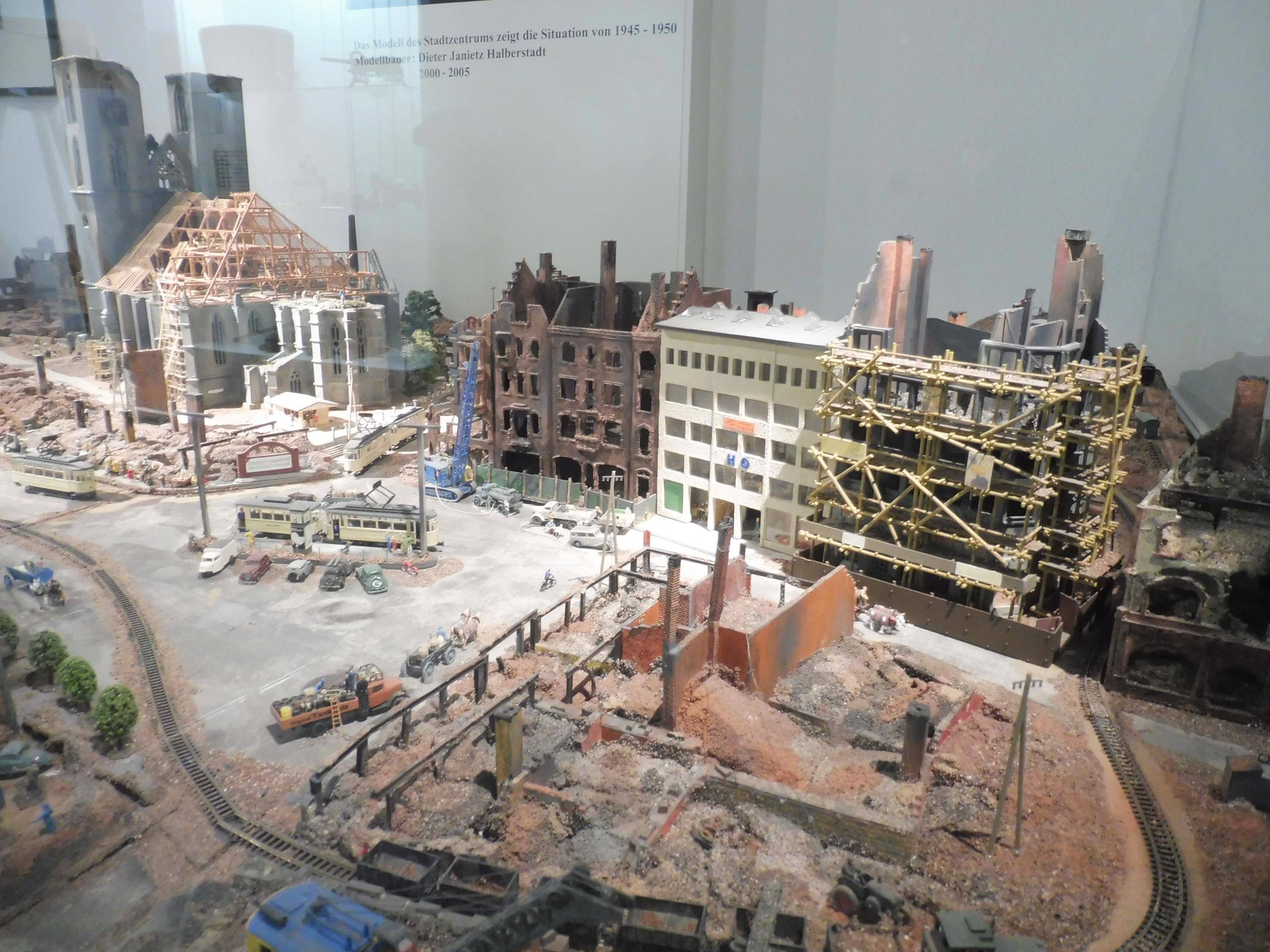 Das Modell zeigt nur eine kleine Fläche der zerstörten Stadt, rund um den Fischmarkt und den Holzmarkt. Neben der Beräumung von Straßen und Plätzen erfolgte im dargestellten Zeitabschnitt ebenfalls der Abriss zerstörter Gebäude. Vollständig erhaltene Ziegelsteine wurden von Mörtelresten befreit und dem Wiederaufbau zugeführt.