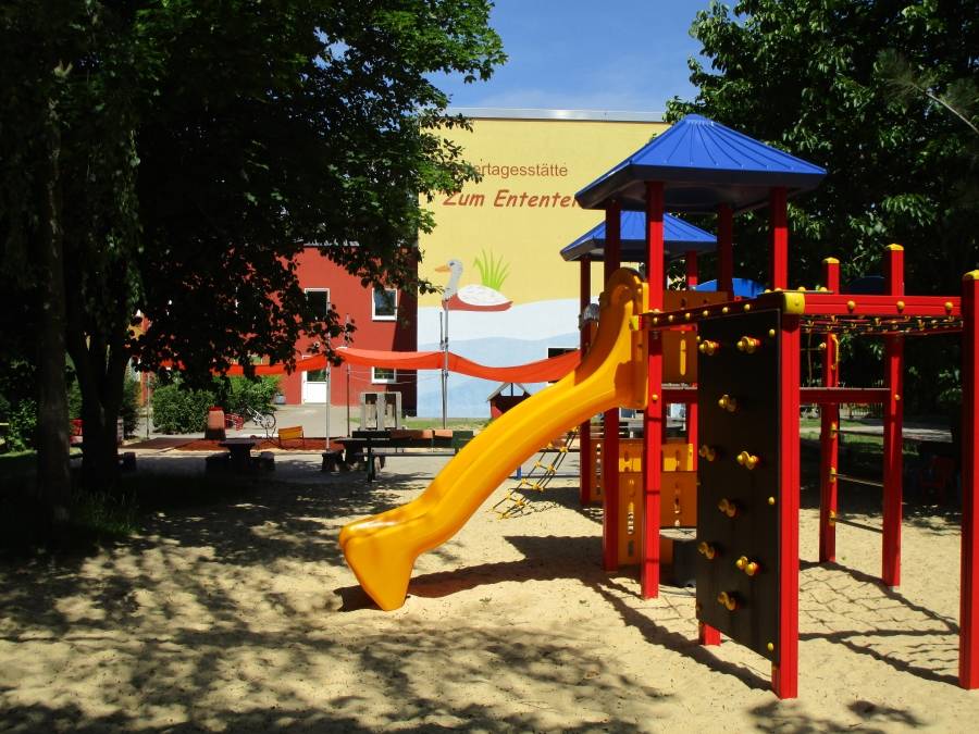 Die Turnhalle wird nicht nur in den Turnstunden am Vormittag, sondern auch für Bewegungsspiele am Nachmittag genutz. Am Mittwoch ist in der Kindertagesstätte "Zum Ententeich" spielzeugfreier Tag,an dem sich die Kinder den ganzen Tag imFreien aufhalten. Hier machen sie die Erfahrung, dass sie sich auch ohne Spielsachen beschäftigen können. Zur Förderung der Gesundheit und des Wohlbefindens bieten die Erzieherinnen den Kindern Kneipp-Anwendungen (Wassertreten warm-kalt) an.