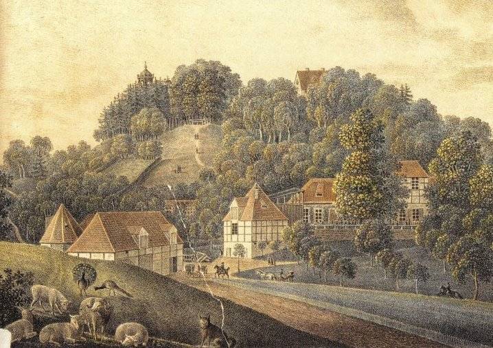 Auf dem Bergkamm wurde 1780/82 das Jagdschlösschen erbaut. Vor die Südfassade integrierte der Bauherr eine Portalrahmung aus dem Jahr 1606 des abgerissenen Schlosses in Gröningen. Ebenfalls aus dem Gröninger Schloss stammte das im Keller befindliche Riesenweinfass. Das Fass besitzt ein Volumen von 144.000 l und wurde im Jahre 2008 als ältestes Riesenweinfass der Welt in das Guinnesbuch der Rekorde aufgenommen.