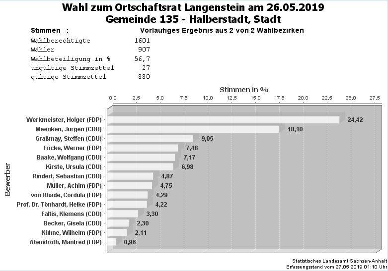 Vorläufiges Ergebnis der Wahl zum Ortschaftsrat Langenstein am 26.05.2019