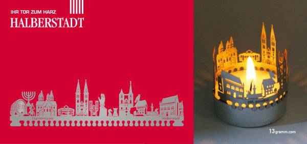 Diese filigrane Ansicht der Kreisstadt kann um jedes handelsübliche Teelicht gesteckt werden. Im Schattenspiel erscheinen die Sehenswürdigkeiten der Stadt.