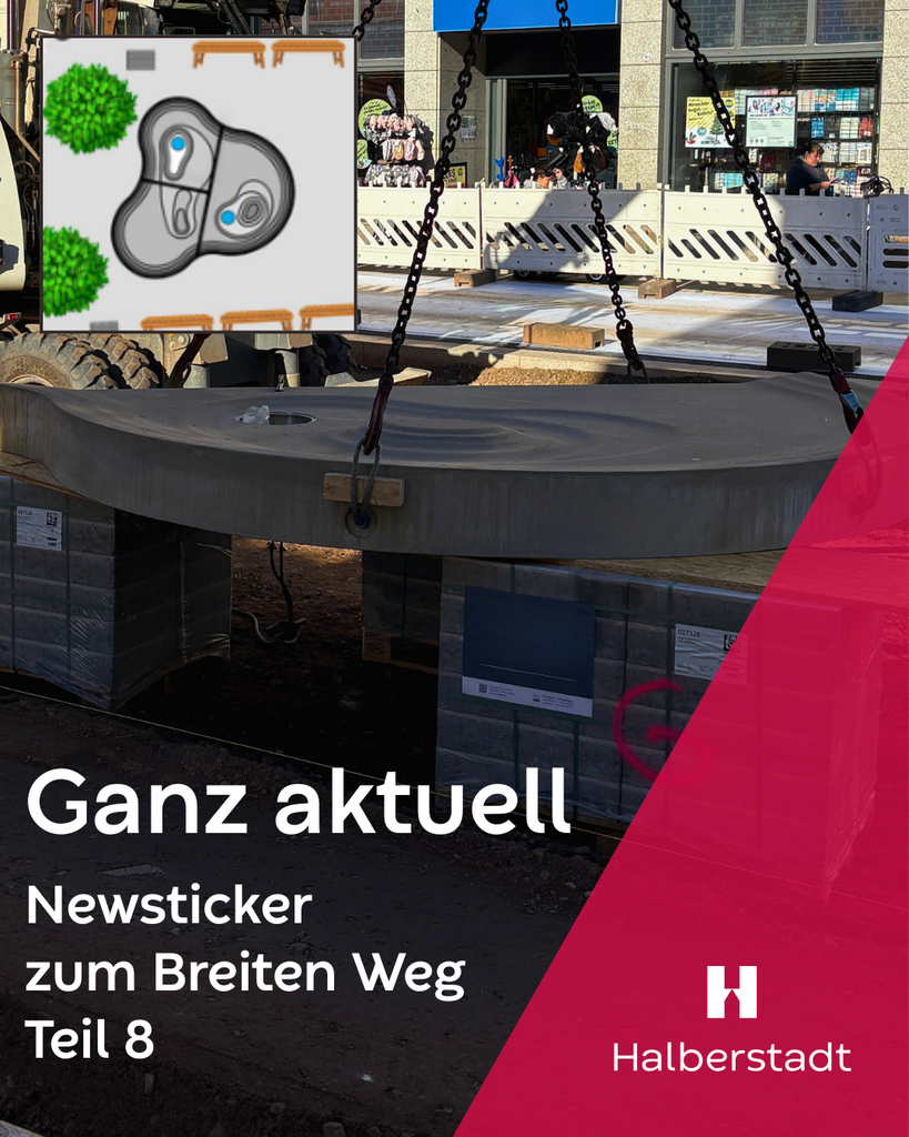 Schritt für Schritt entsteht das neue Highlight am Breiten Weg: unser Wasserspiel! Die großen, geschwungenen Betonfertigteile (insgesamt rund 5 x 5 Meter groß) sind bereits gesetzt – sie bilden später die Grundstruktur für ein begehbares Wasserspiel, das den Breiten Weg noch lebendiger und einladender machen wird.