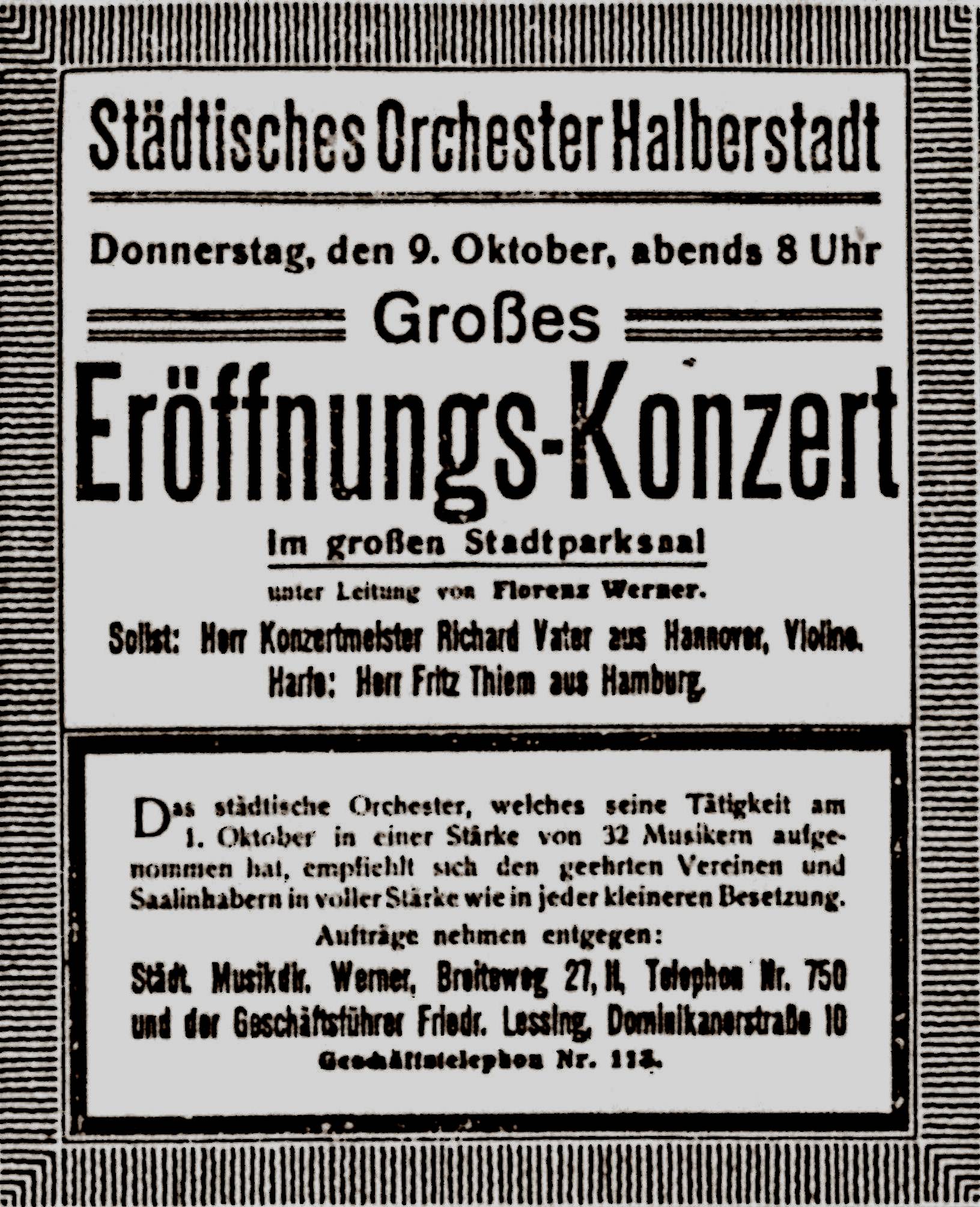 Der aufmerksame Leser erfährt, dass hier das Städtische Orchester Halberstadt einlädt, welches seine Tätigkeit vor 7 Tagen also am 1. Oktober aufgenommen hat. Und es wird bekannt gegeben, dass das Orchester aus 32 Musikern besteht.