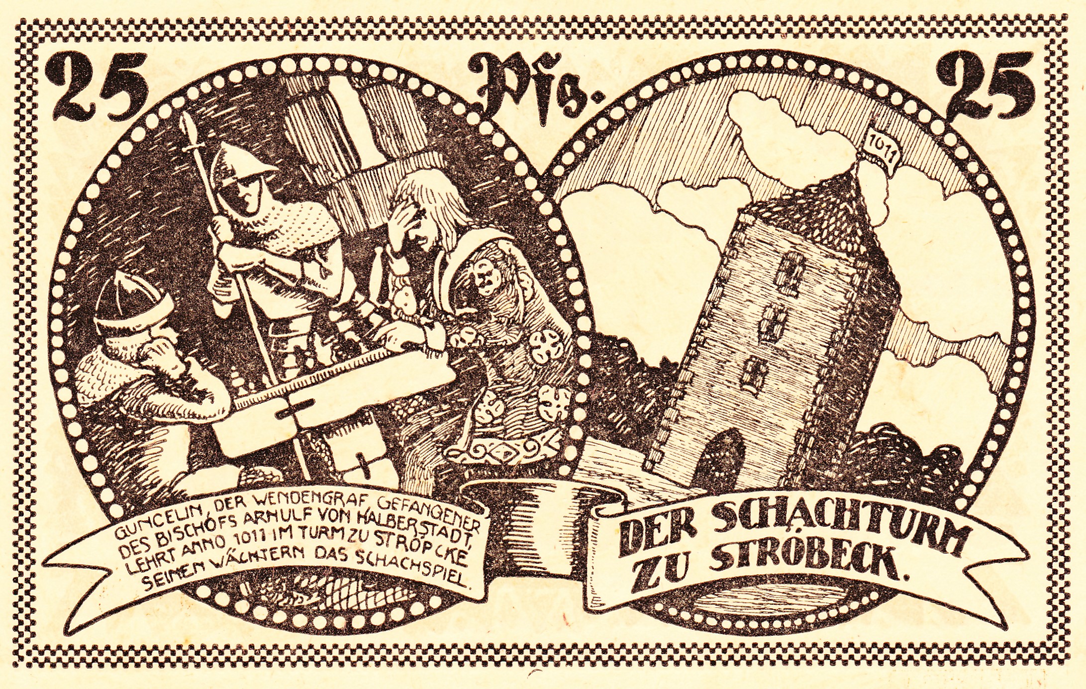 Legenden erzählen, dass im 11. Jh., frühestens 1011, der Halberstädter Bischof einen vornehmen Kriegsgefangenen im Ströbecker Wartturm festsetzen ließ. Die Bauern, die ihn bewachten, behandelten ihn gut und er lehrte sie das Schachspiel. Seither wurde das Spiel von Generation zu Generation weitergegeben.