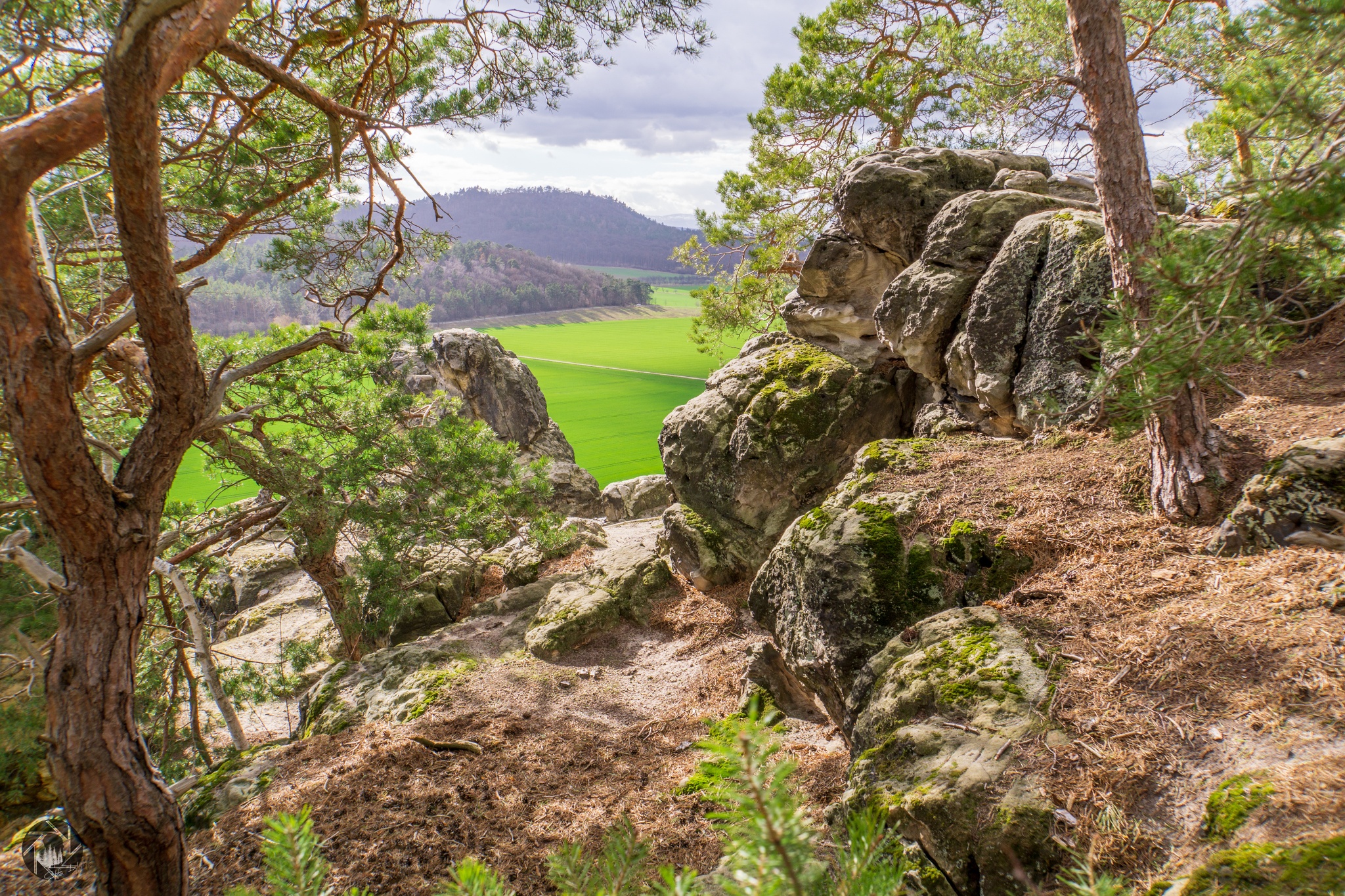 Erklimmen Sie den Felsen, so können Sie die gesamten Thekenberge bestaunen (auf der linken Seite), sowie das Dornfeld mit Dornstein und den Winterberg (auf der rechten Seite).