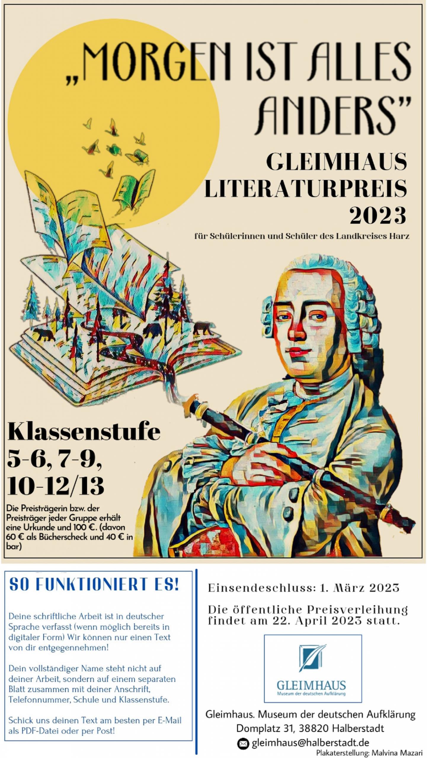 Das Gleimhaus lädt alle Schülerinnen und Schüler recht herzlich ein, sich an dem Gleimhaus-Literaturpreis 2023 zu beteiligen. Einsendeschluss ist der 1. März 2023. Das diesjährige Thema ist „Morgen ist alles anders“. Was ist morgen denn anders? Oder ist morgen tatsächlich alles anders? Dies und andere Fragen können zum Schreiben anregen, wobei die literarische Form freigestellt ist.