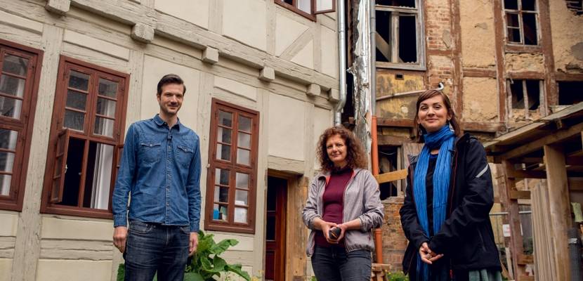 Zusammen mit Geschäftsführerin Claudia Hennrich vom Fachwerkzentrum Quedlinburg besichtigen (Mitte) besichtigen Adrian und Émilie das Propsthaus (Grudenberg 7) aus dem 17. Jahrhundert in Halberstadt.