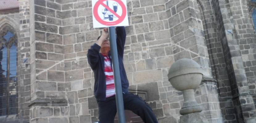 Bildunterschrift: Wolfgang Hartmann, Mitarbeiter der Ordnungsabteilung der Stadt, beim Anbringen der Schilder, die auf das Alkoholverbot im Stadtzentrum hinweisen. (Foto: Stadtverwaltung Halberstadt)