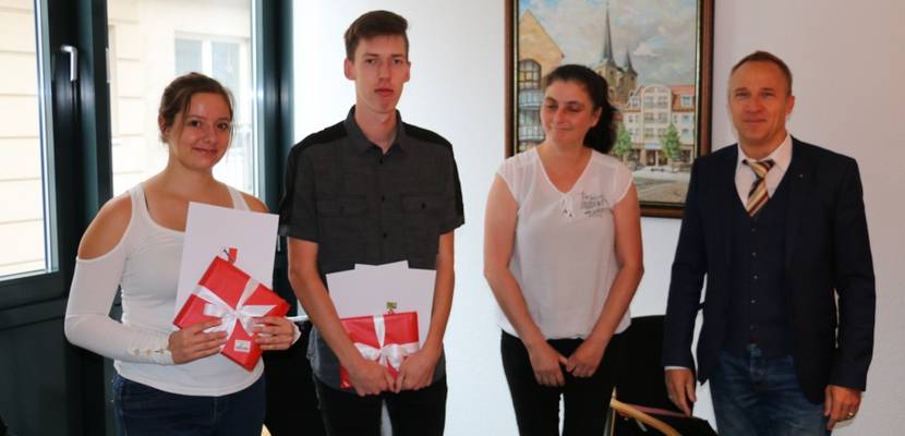 (von links) Glückwünsche für die fertigen Azubis der Stadtverwaltung: Viktoria Stelter, Eric Freise, Ausbildungsleiterin Anke Dietrich und Oberbürgermeister Andreas Henke.