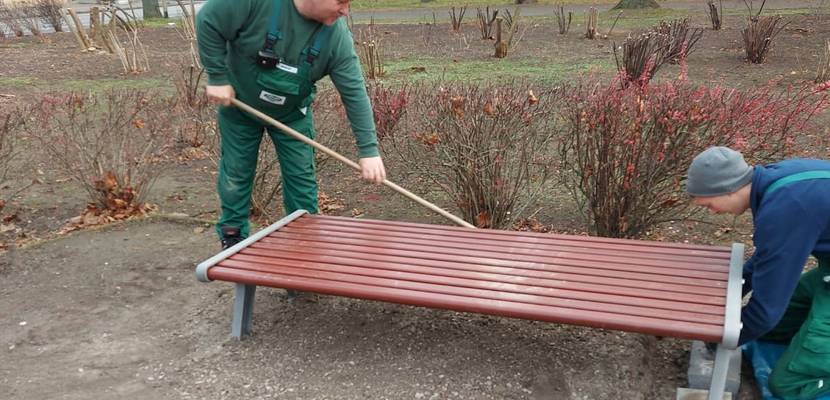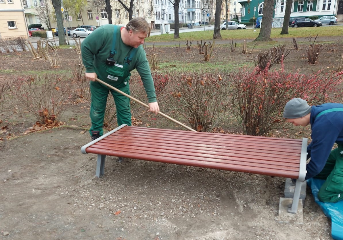 Noch im alten Jahr konnten im Käthe-Kollwitz-Park zwei Bänke wieder aufgestellt werden, die bereits vor längerer Zeit abgebaut werden mussten. Stala-Mitarbeiter Ronny Ahrens (links) und Tino Meinecke hier beim Befestigen einer der Bänke im Fundament. Den Reparatur- und Aufbauauftrag hatte die Tiefbauabteilung der Stadt an den Stadt- und Landschaftspflegebetrieb erteilt. Die Reparatur und das Aufstellen hat die Stadt ca. 1.000 Euro gekostet.