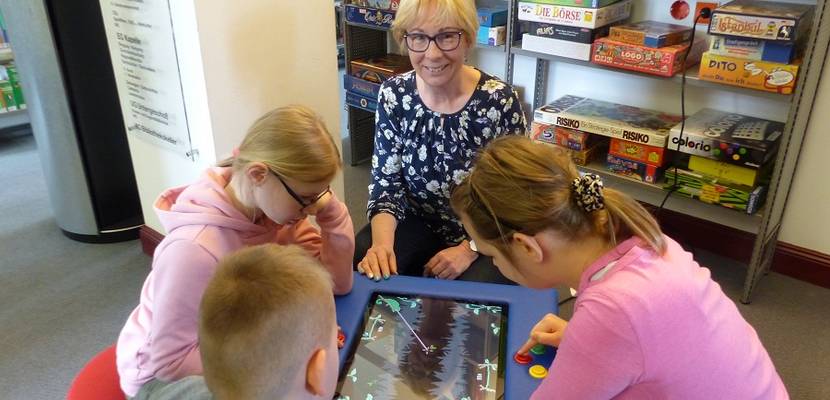 Hier probieren sich (von links) Jannie, Jonas, Victoria und die Leiterin der Bibliotheksfördervereins, Margit Langer, an der neuen Kulti-Konsole.