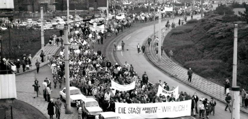 Friedliche Demonstration mit Transparent "Die Stasi arbeitet weiter, wir auch", Hoher Weg, Herbst 1989, Foto: unbekannt, Städtisches Museum Halberstadt