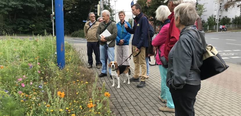 Am gelungenen Beispiel einer Blühwiese am Standort Westendorf/Ecke Sternstraße beantwortet Carsten Knobbe von der Saaten-Union die Fragen interessierter Halberstädter.