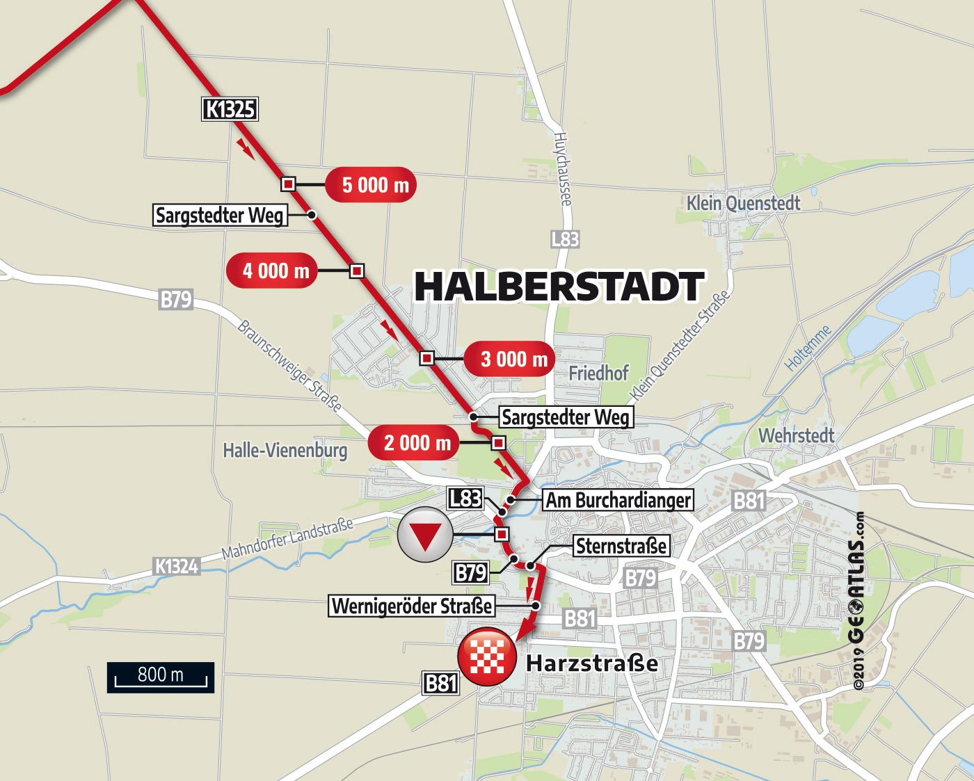 Ausgehend von der Huystraße in Athenstedt, weiter über die B79 nach Aspenstedt und die Halberstädter Straße nach Sargstedt, geht es Richtung Halberstadt. Vom Sargstedter Weg aus führt die Strecke weiter am Burchardianger entlang über die Sternstraße bis zur Zieleinfahrt in der Wernigeröder Straße.