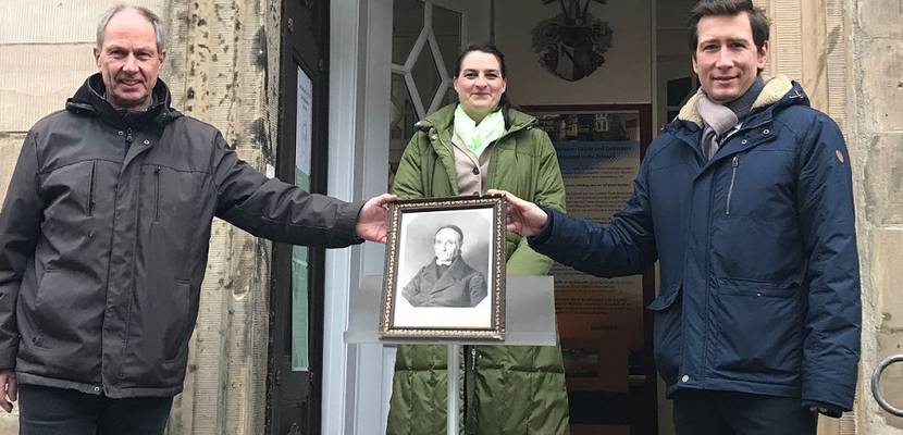 Private Schenkung: Dr. Eberhard Brecht, Mitglied des Bundestages und ehemaliger Oberbürgermeister von Quedlinburg (links), überreicht an Halberstadts Oberbürgermeister Daniel Szarata im Beisein der Museumsdirektorin Dr. Antje Gornig eine Druckgrafik mit dem Porträt von Christian Friedrich Bernhard Augustin, Oberdomprediger und Ehrenbürger der Stadt Halberstadt. Das Bild zeigt den Gelehrten im Ornat eines Dompredigers.