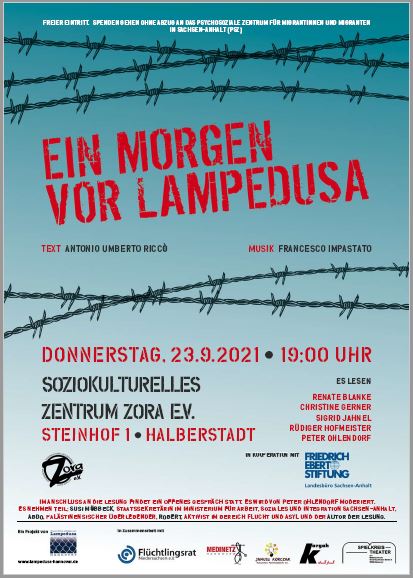 Am 23.09.2021 veranstaltet das Soziokulturelle Zentrum ZORA e.V. in Kooperation mit der Friedrich-Ebert-Stiftung (Landesbüro Sachsen-Anhalt) die Szenische Lesung “Ein Morgen vor Lampedusa”.