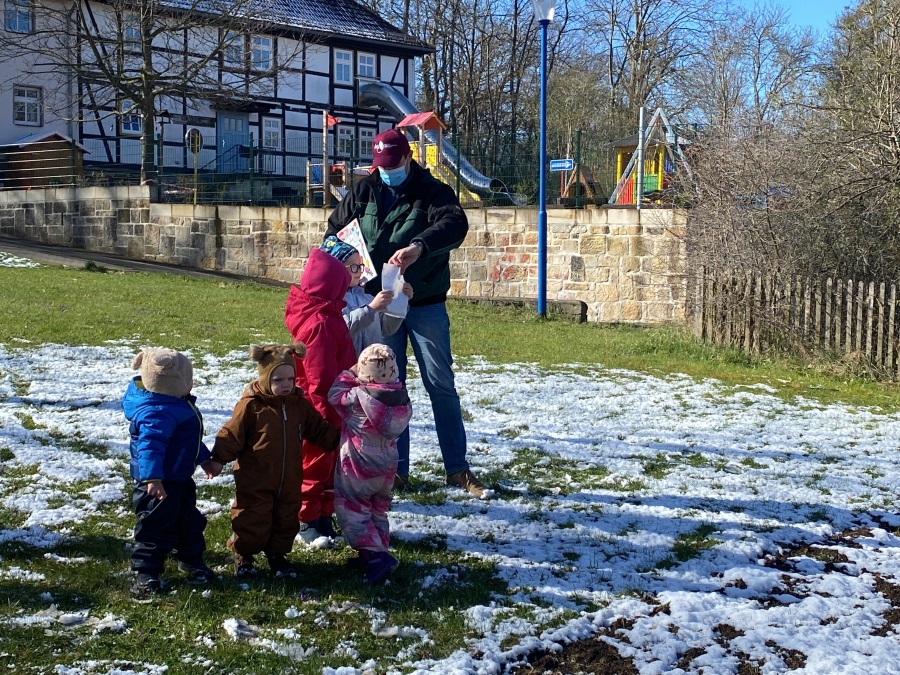 Bild: Anton, Lucie, Max, Leni und Salvador freuen sich über die Wiesenkräuter, die ihnen Sven Schneider, Produktmanager der Firma ISP, überreichte. Mitte / Ende April werden die Jungen und Mädchen beim Aussäen des Saatgutes in den 40 Meter langen und zwei Meter breiten Pflanzsteifen vor ihrer Kita auf der Wiese Am Pfahlberg helfen.