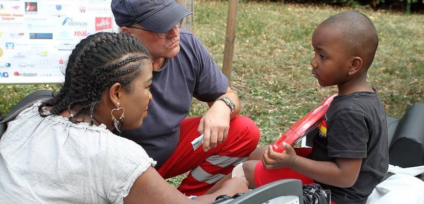 Foto: Ein Rettungssanitäter bewertet Nathans Knieverletzung beim Integrationstag in Halberstadt