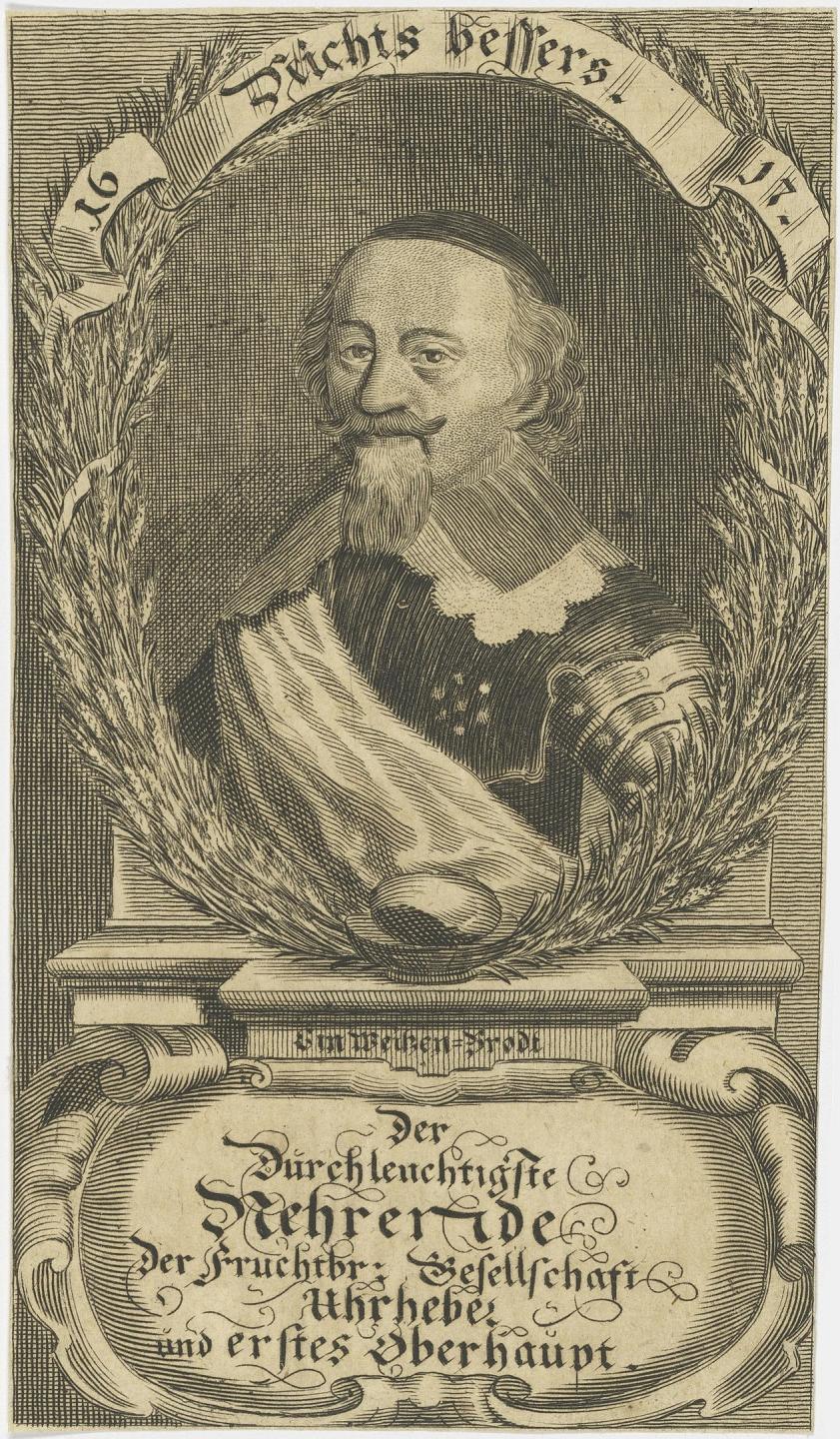 Bildunterschrift: Ludwig I. von Anhalt-Köthen (1579-1650) mit seinem Wahlspruch „Nichts besser“ und einem Weizenbrot, seinem Symbol, sowie mit seinem Gesellschaftsnamen „Der Nährende“, Kupferstich von A. Römer, 1668, Universitätsbibliothek Leipzig.