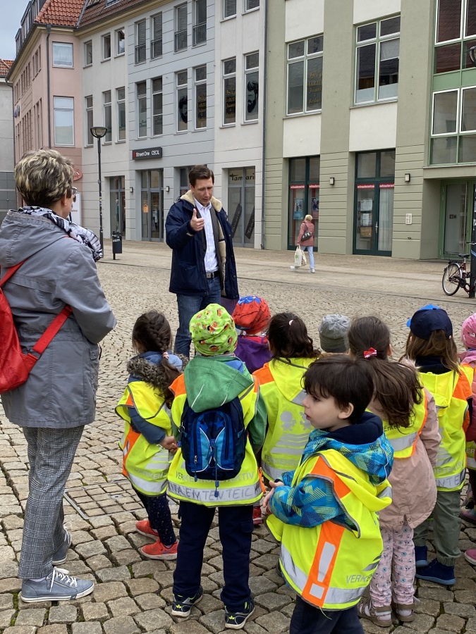 Bild 1: Oberbürgermeister Daniel Szarata im Gespräch mit den Kindern der Kita Ententeich