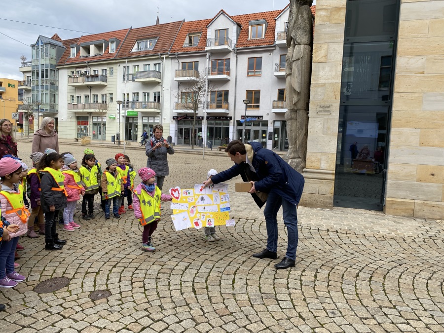 Am Montag, den 29. März 2021, besuchten die Kinder der Kita Ententeich den Oberbürgermeister Daniel Szarata vor dem Rathaus. Mit zwei großen, gebastelten Collagen im Gepäck wollten die Kinder und Erzieherinnen zum Ausdruck bringen, wie sehr sie ihre Kita vermissen. Natürlich interessierte es sie auch, wann sie wieder in ihre Einrichtung zurück können und wie der Zeitplan für die Umbaumaßnahmen aussieht.