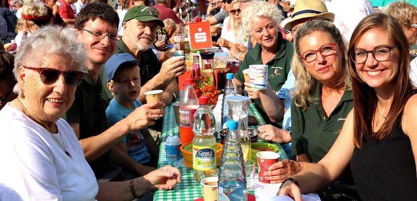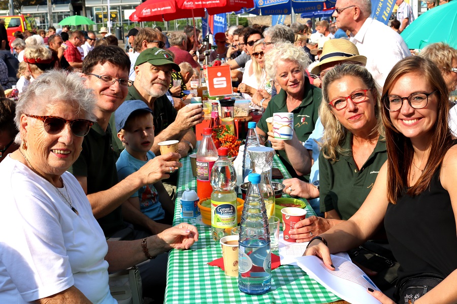 84 Tische waren am Sonntag beim Bürgerbrunch von gut gelaunten Halberstädtern und Freunden der Stadt bei bestem Sommerwetter besetzt. Die Organisatoren sind zufrieden. „So viele Bierzeltgarnituren haben wir noch nie vergeben beziehungsweise vermietet, im vergangenen Jahr waren es 81“, berichtet Carolin Timplan aus dem Organisationsteam im Ratsbüro stolz. Halberstadts Oberbürgermeister Andreas Henke begrüßte die etwa 800 Teilnehmerinnen und Teilnehmer des 11. Bürgerbrunches. Das gesellige Beisammensein und Frühstücken für einen guten Zweck kam in diesem Jahr der Verbraucherzentrale, dem Diakonischen Werk im Kirchenkreis Halberstadt, dem Verein für krebskranke Kinder im Harzkreis und der Musikschule Fröhlich zugute. Außerdem wurde der Preis an den Gewinner der Mitmachaktion der Pfingstgemeinde Halberstadt im Rahmen der Schatzjahre 2019 überreicht. Demzufolge gingen 1.000 Euro Preisgeld an die Harzer Handartisten, die das Geld für die Umsetzung ihres Projektes „Sehenswürdigkeiten mit Kurzfilmen in Gebärdensprache erklären“ einsetzen wollen. Für gute Unterhaltung sorgten zudem die „Dancing Kids“ und die Musikschule Fröhlich auf dem Holzmarkt. Im Anschluss an den Bürgerbrunch gesellten noch weitere Besucher zu den Gästen an den Tischen des Cafès Kulit(viert) an der Martinikirche.
