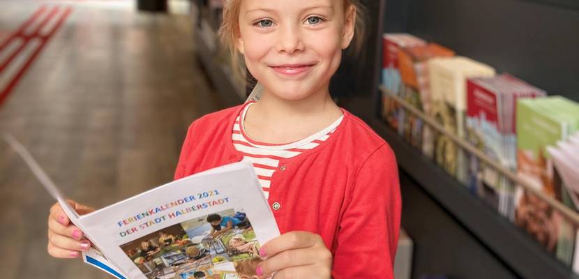 Bildunterschrift: Die 6-Jährige Emilia schaut sich in der Tourist Information den Ferienkalender der Stadt Halberstadt an. Dieser beinhaltet spannende Angebote der städtischen Einrichtungen für die diesjährigen Sommerferien. (Fotos: Nicole Huhn, Tourist Information Halberstadt)
