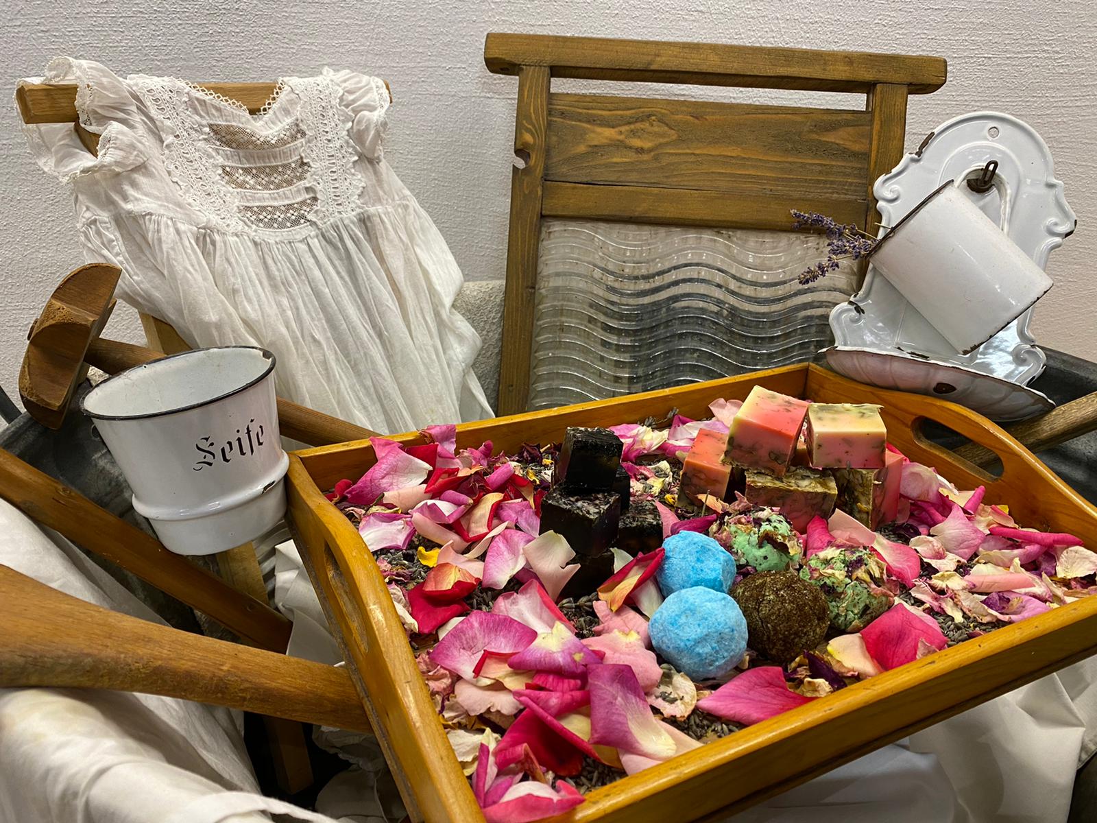 Im Schraube-Museum wird wieder die beliebte Aktion „Schräubchens Seifenzauber“ für Kinder zwischen 5-18 Jahren angeboten. Dabei kann jedes Kind eine eigene Seife oder Badekugel selber herstellen und hierbei Farbe und Duft durch den Zusatz von Kräutern oder getrockneten Blütenblättern – natürlich alles ökologisch unbedenklich – selbst bestimmen und anschließend im eigenhändig gefertigten Geschenksäckchen mit nach Hause nehmen. Dazu wird selbstverständlich auch beim Rundgang durch die Wohnräume von Fräulein Schraube anschaulich erklärt, wie zu Uromas Zeiten Körperhygiene im Gegensatz zu heute funktionierte.