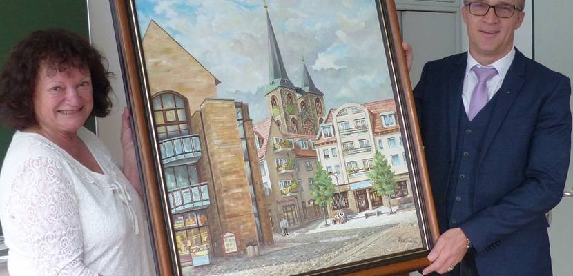 Gabriele Nehrkorn, Tochter des Malers Waldemar Plaisant, übergibt das Gemälde ihres Vaters im Namen ihrer Schwestern Sonja Niemeyer und Heidemarie Neppe, die ebenfalls anwesend waren, an Oberbürgermeister Andreas Henke. (Foto: Ute Huch/Pressereferentin/Stadt Halberstadt)