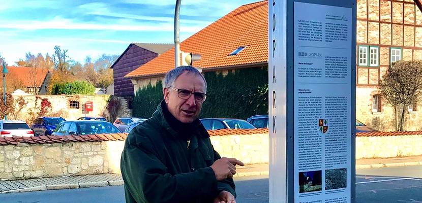 Die Präsentation der Geoparkstele in Athenstedt erfolgte durch Dr. Klaus George, Leiter Natur- und Geopark. (Foto: Stadtverwaltung Halberstadt)