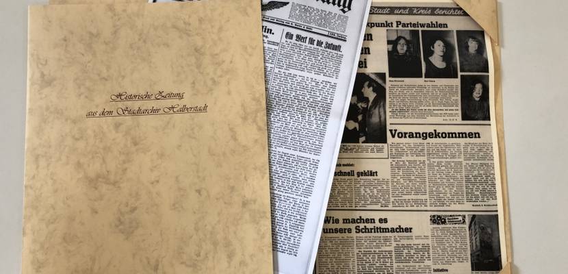Das Angebot an nachdruckbaren historischen Zeitungen im Stadtarchiv ist vielfältig und umfasst bspw. alle Jahrgänge der „Volksstimme“ ab 1947, „Halberstädtische Zeitung“ ab 1866, „Halberstädter Intelligenzblatt und Zeitung“ ab 1870 oder der älteste Bestand mit dem „Intelligenzblatt für die Districte Halberstadt und Blankenburg“ aus dem Jahr 1808.