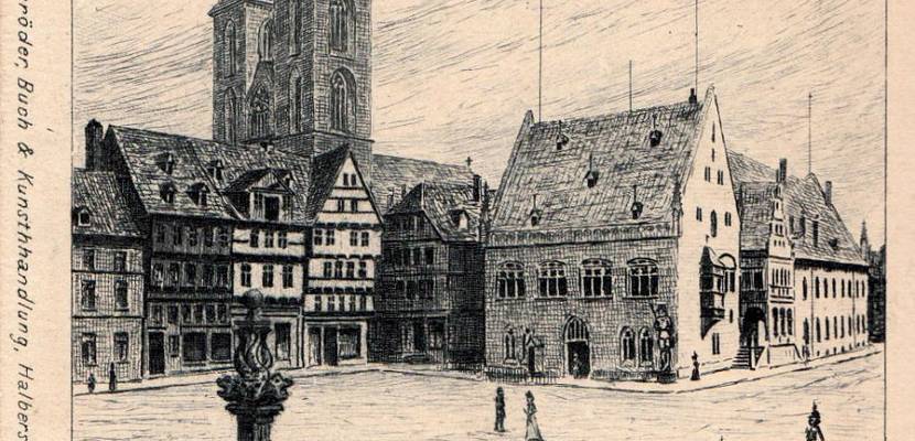 Die Abbildung zeigt eine sogenannte Künstler-Ansichtskarte von A. Bruck von 1899 mit dem Motiv „Holzmarkt mit Rathaus in Halberstadt“. Privatsammlung / Archiv: M. Stribrny