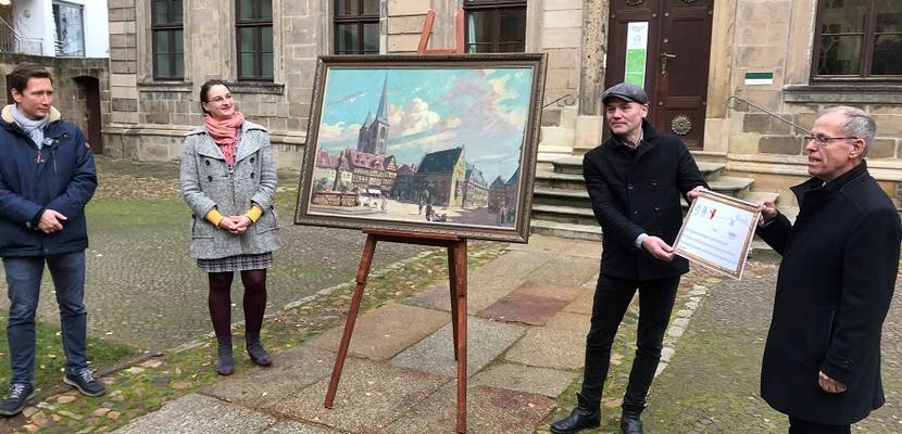 Große Freude in Halberstadt. Heute (26. November 2020) übergab Christian Vechtel vom Auktions- und Antiquitätengeschäft Zeitgenossen Münster ein in Halberstadt bis dahin unbekanntes Walter-Gemm-Gemälde mit einer Holzmarktansicht aus dem Jahr 1930 an das Städtische Museum. Entgegengenommen haben es Dr. Antje J. Gornig, Direktorin des Städtischen Museums, Daniel Szarata, Landtagsabgeordneter und Stadtrat, und Dr. Volker Bürger, Vorsitzender des Halberstädter Geschichtsvereins, die Initiatoren der grandiosen Spendensammlung zum Erwerb des Bildes.