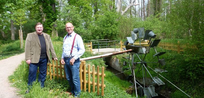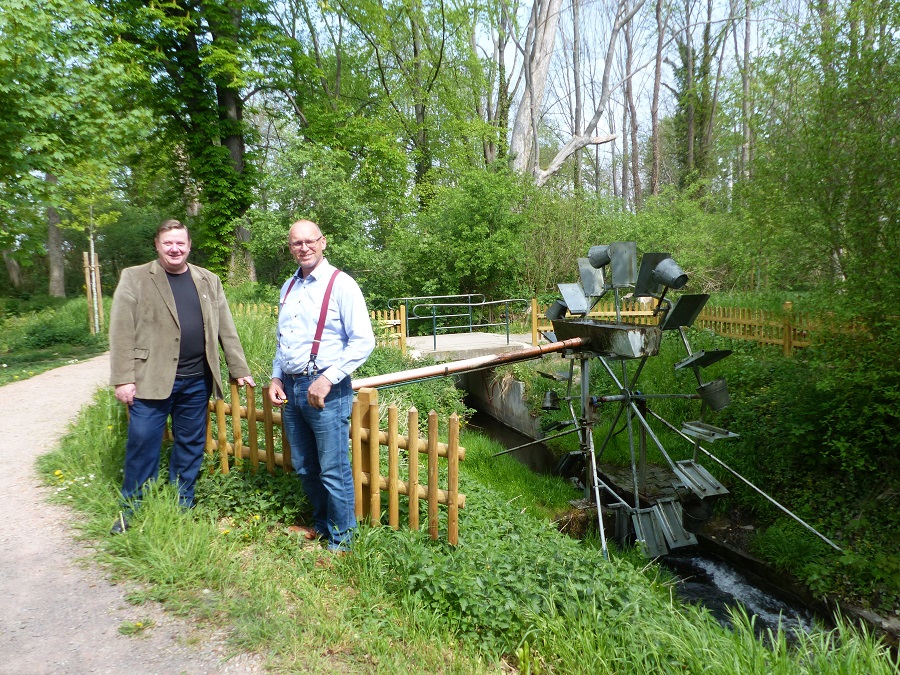 Weiterhin wurde das Mühlrad durch einen neuen Zaun gesichert. Ortsbürgermeister Guido Spillecke dankt der Tiefbauabteilung, die den Zaun finanziert hat. Gemeindearbeiter Hagen Godisch muss neben seinen anderen umfangreichen Arbeiten dafür sorgen, dass das Mühlrad im Gang bleibt, weil dieses Wasser den Dorfteich versorgt. Darüber hinaus kann es auch als Löschwasser genutzt werden.
