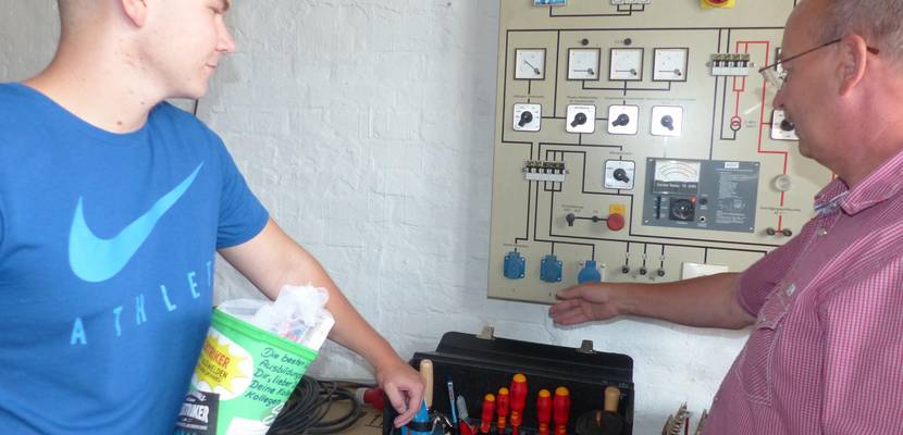 Dirk Bodenstein, Leiter des Bereiches Stadtbeleuchtung, erklärt Dominik Winningstedt die Funktionsweise einer Messtafel in der Werkstatt. Zum Start hat der Azubi vom Stala eine Werkzeugtasche und alles, was zur persönlichen Schutzausrüstung gehört, erhalten. Und, was zum Schulbeginn nicht fehlen darf: Eine Schultüte.