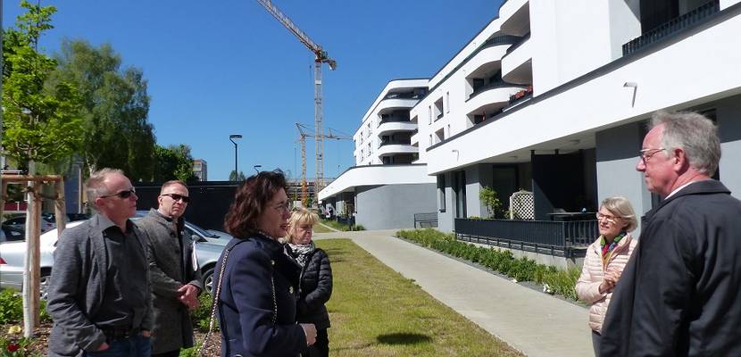(von links) Jens Klaus, Fachbereichsleiter Stadtentwicklung, Oberbürgermeister Andreas Henke, HaWoGe-Geschäftsführerin Beate Grebe, Petra Heise, Geschäftsführerin der Architektenkammer Sachsen-Anhalt, Stadtplanerin Siegrun Ruprecht und Prof. Axel Teichert, Präsident der Architektenkammer, vor der Südseite der „Lindenhofterrassen“ im Stadtzentrum von Halberstadt.