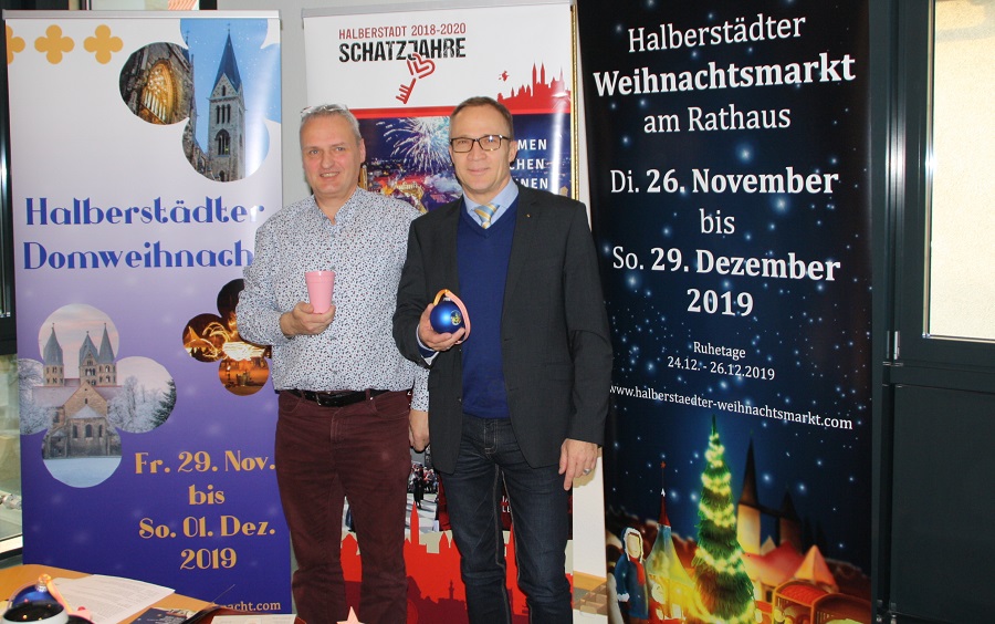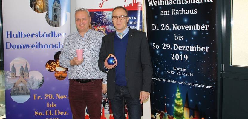 Halberstadts Oberbürgermeister Andreas Henke (rechts) und Jens Ganso, Chef der Veranstaltungs-COM GmbH stellen im Rathaus das Programm für den diesjährigen Halberstädter Weihnachtsmarkt vor und freuen sich auf viele Besucher. (Foto: Ute Huch/Pressestelle/Stadt Halberstadt)