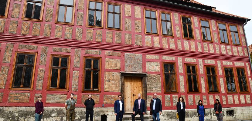 Im Mittelpunkt des Gespräches mit Geschäftsführerin Claudia Hennrich vom Deutschen Fachwerkzentrum, Mitarbeiter*innen und Bundesfreiwilligen standen die aufwendigen Arbeiten von der Gebäudesi-cherung über die Schwammbekämpfung bis zur Innenraumgestaltung. Dafür nahmen sich