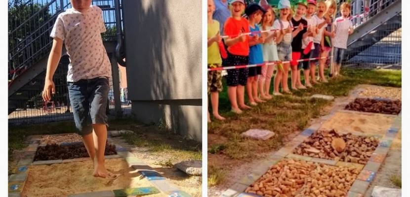Unterschrift: Der neue Barfußpfad wurde von den KITA-Kindern begeistert aufgenommen