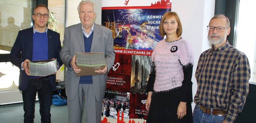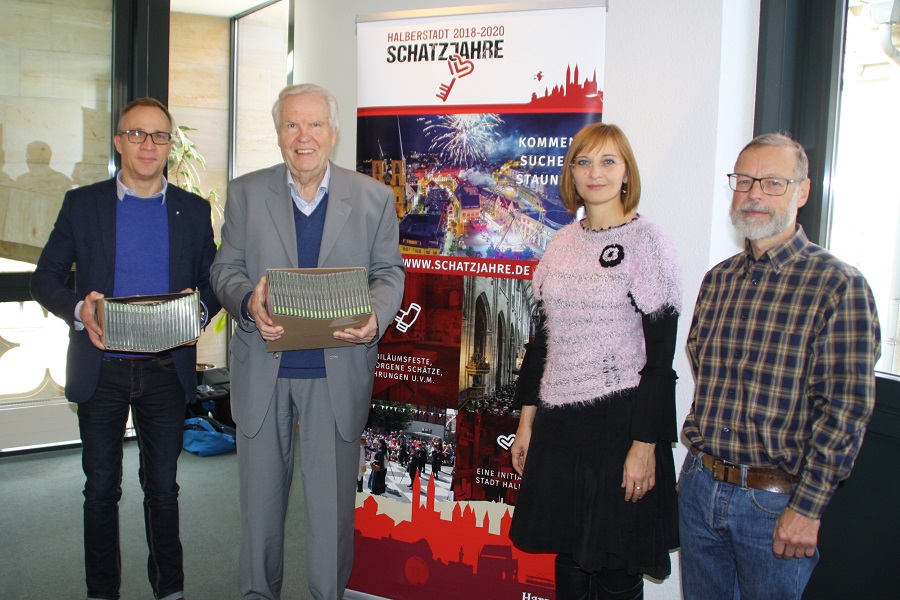 100 Klassik-CDs für die Stadt als Gastgeschenke: (von links) Oberbürgermeister Andreas Henke, Hartmut Wettges, Vorsitzender des Kammermusikvereins, sowie Olga Bechtold und Rüdiger Holz, beide im Vorstand des Kammermusikvereins, im Rathaus bei der Übergabe. (Foto: Ute Huch/Pressereferentin/Stadt Halberstadt)