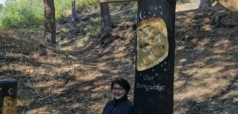 Die Halberstädter Buchautorin Kathrin R. Hotowetz hier vor dem Klusfelsen in Halberstadt an einer der ersten aufwändig gestalteten Stelen für die Beschilderung der Schauplätze des Kultur- und Literaturprojektes "Das versunkene Heiligtum".