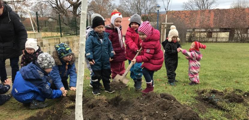 Kinder der Kita "Kunterbunt" pflanzen eine Elsbeere