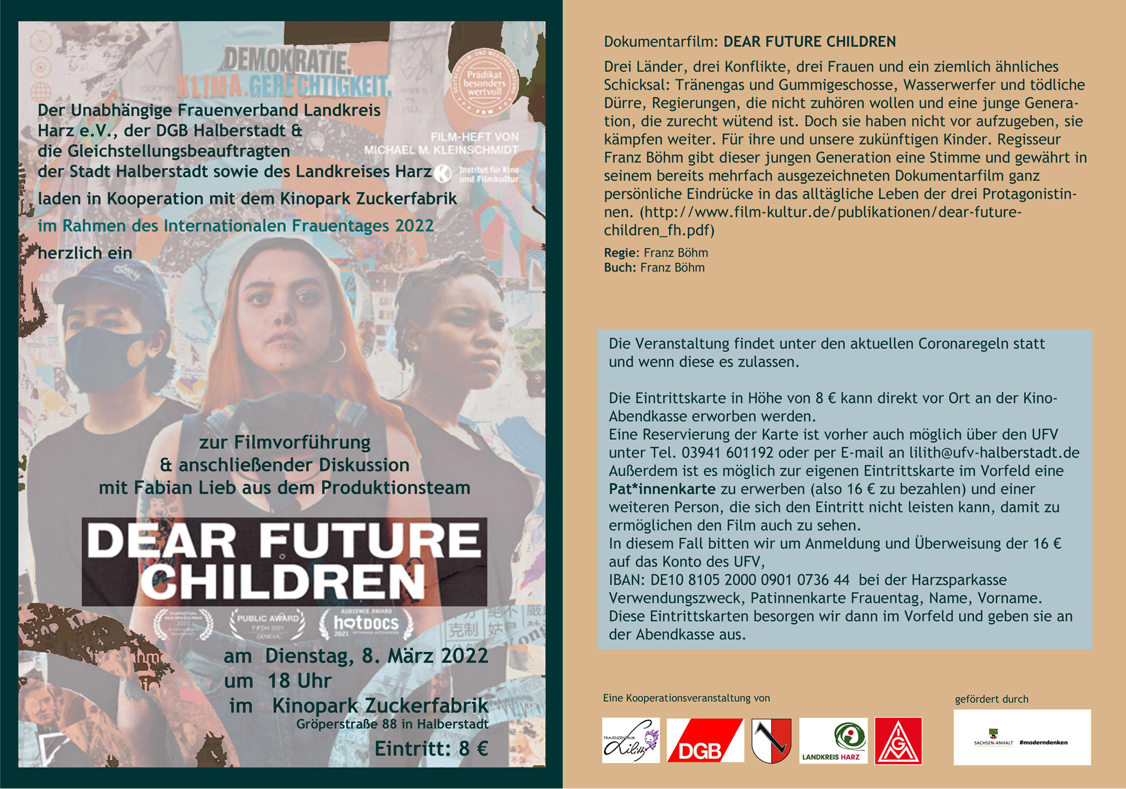 Zum diesjährigen Internationalen Frauentag lädt der Deutsche Gewerkschaftsbund, der Unabhängigen Frauenverband Landkreis Harz e.V., die IG Metall, die Gleichstellungsbeauftragten der Stadt Halberstadt sowie des Landkreises Harz in Kooperation mit dem Kinopark Zuckerfabrik zu einer Filmvorführung mit anschließender Diskussion ein.