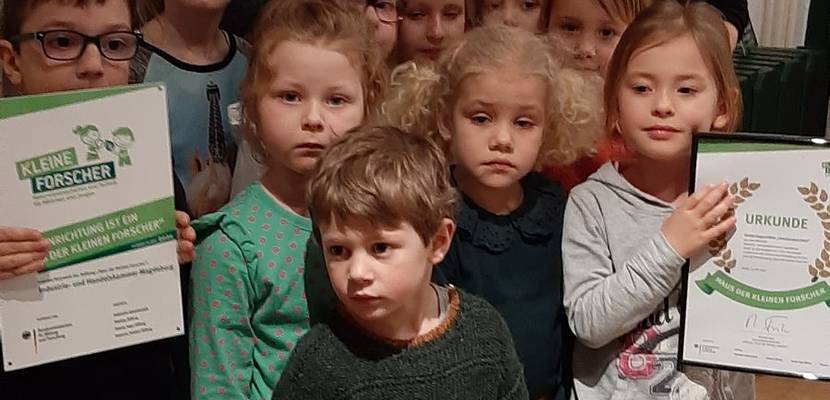 Foto: Die Kinder der Kita Holzbergwichtel mit der Urkunde „Haus der kleinen Forscher“. (Foto: Kita Holzbergwichtel/Stadt Halberstadt)