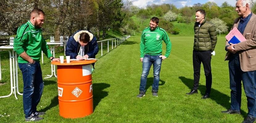 Bildunterschrift: Oberbürgermeister Daniel Szarata unterzeichnet den neuen Betriebsführungsvertrag mit dem Sportverein Grün-Gelb Ströbeck e.V.