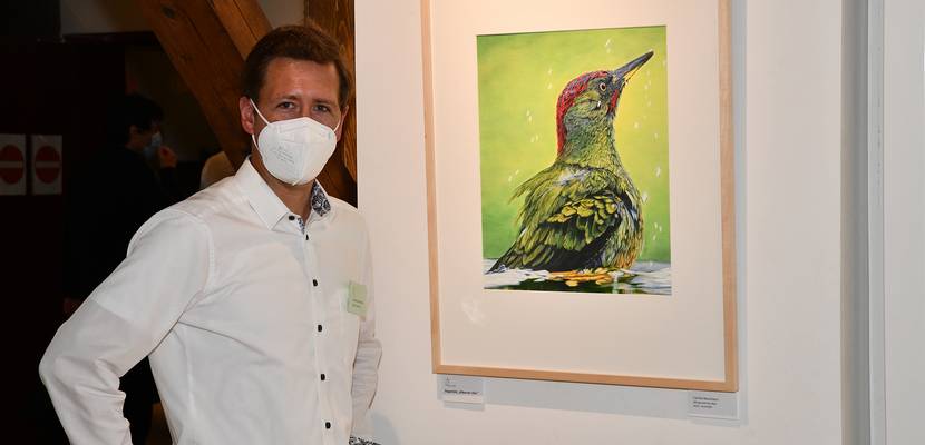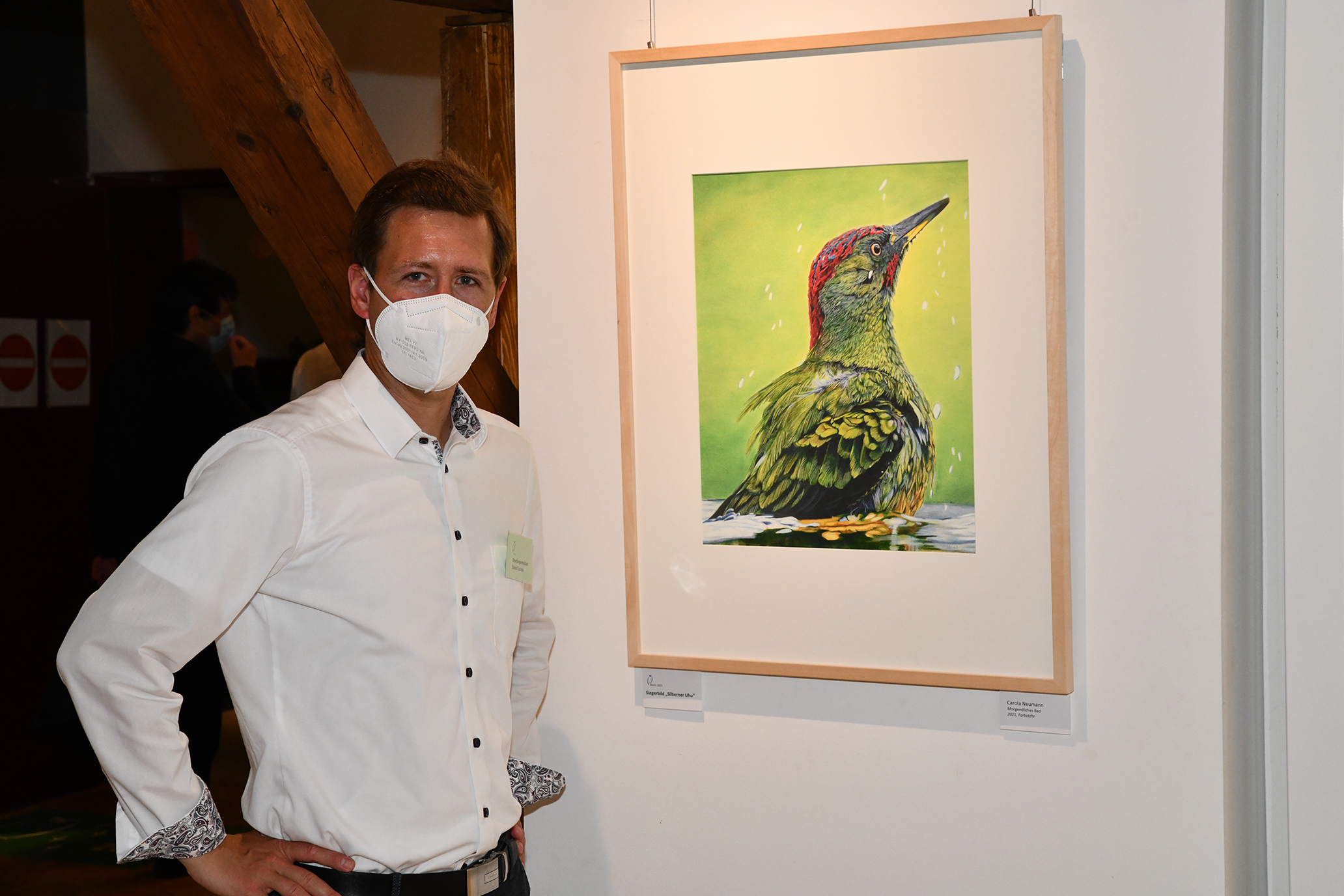 Oberbürgermeister Daniel Szarata vor dem Siegerbild „Silberner Uhu“ – „Morgendliches Bad“ von Carola Neumann