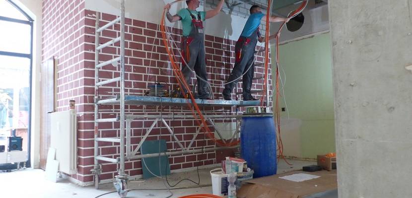 Matthias Dannenberg (links) und Laurin Kress von der Firma Stadler verlegen insgesamt 1.000 Meter Datenkabel für die moderne Technik in den zukünftigen Räumen der Tourist Information Halberstadt. (Foto: Ute Huch/Pressestelle/Stadt Halberstadt)