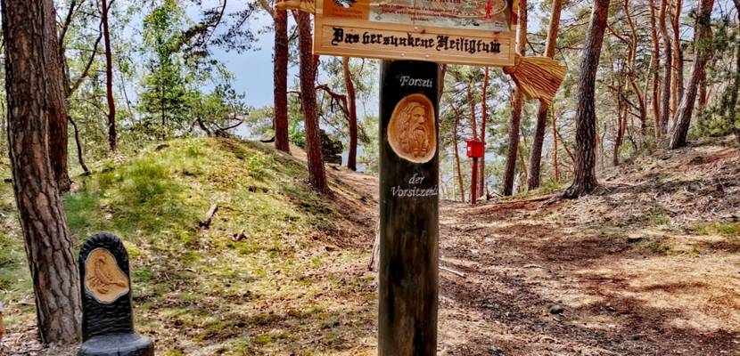 Mit dem Aufstellen von außergewöhnlichen, handgefertigten Hinweisschildern aus großen, geschnitzten Holzstämmen soll das Auffinden und die Information zu den Punkten des "versunkenen Heiligtums" verbessert werden. In die beeindruckenden Holzstelen wurden Motive nordischer Gottheiten und die entsprechenden Sternzeichen geschnitzt. Die Schnitzarbeiten führte die AFU Privates Bildungsinstitut GmbH im Rahmen einer von der KoBa Jobcenter Landkreis Harz finanzierten Maßnahme durch.